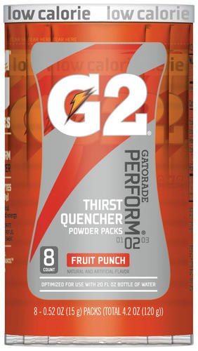 The G2 series has all the electrolytes of original Gatorade with only 20 calories. Gatorade is a well-researched, scientifically proven method of re-hydrating during exercise. G2 Powder Sticks enhance athletic performance by stimulating fluid absorption, helping the body maintain fluid balance, and providing fuel to working muscles. G2 Gatorade hydrates more effectively than water alone. Gatorade G2 Fruit Punch sticks are perfect for an on-the-go supply of Gatorade. Simply add one of theses 0.52 single-serving packets to 20 oz of water and shake bottle to mix. Ingredients: sucrose, citric acid, natural and artificial flavor, salt, sodium citrate, monopotassium phosphate, modified food starch, calcium silicate, sucralose, red 40, acesulfame potassium. Read more...